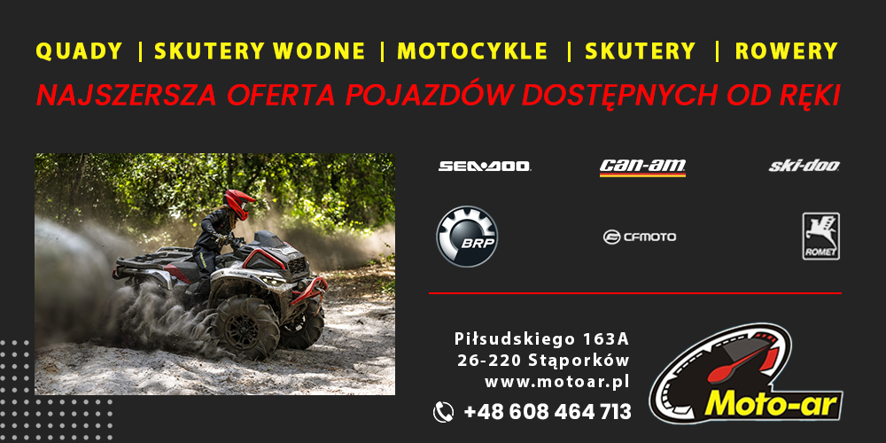 Firma MOTO-AR została założona w styczniu 1994 roku. Profesjonalne kształcenie oraz kilkunastoletnie doświadczenie pozwala nam na  fachową obsługę i doradztwo w naprawie motocykli, quadów oraz skuterów. Jako autoryzowany dealer MOTO-AR, oferujemy produkty marki BRP: CAN–AM, SPYDER, SEA–DOO, SKI-DOO, LYNX i EVINRUDE, takie jak: akcesoria, łodzie, odzież, osprzęt, pojazdy ATV, silniki, skutery wodne, skutery śnieżne. Wychodząc naprzeciw oczekiwaniom naszych klientów rokrocznie powiększamy swoją ofertę wprowadzającnowe marki, takie jak np. Linhai, CF Moto i inne.  Do sprzedawanych pojazdów oferujemy serwis gwarancyjny i pogwarancyjny oraz części i akcesoria.   akcesoria, BRP, CAN–AM, CF Moto, części BRP, EVINRUDE, LYNX, łodzie, motocykle, motorowery, odzież, on-road, osprzęt, pojazdy ATV, quady, rowery, SEA–DOO, silniki, SKI-DOO, skutery, skutery śnieżne, skutery wodne, SPYDER, spyder ryker, traxter